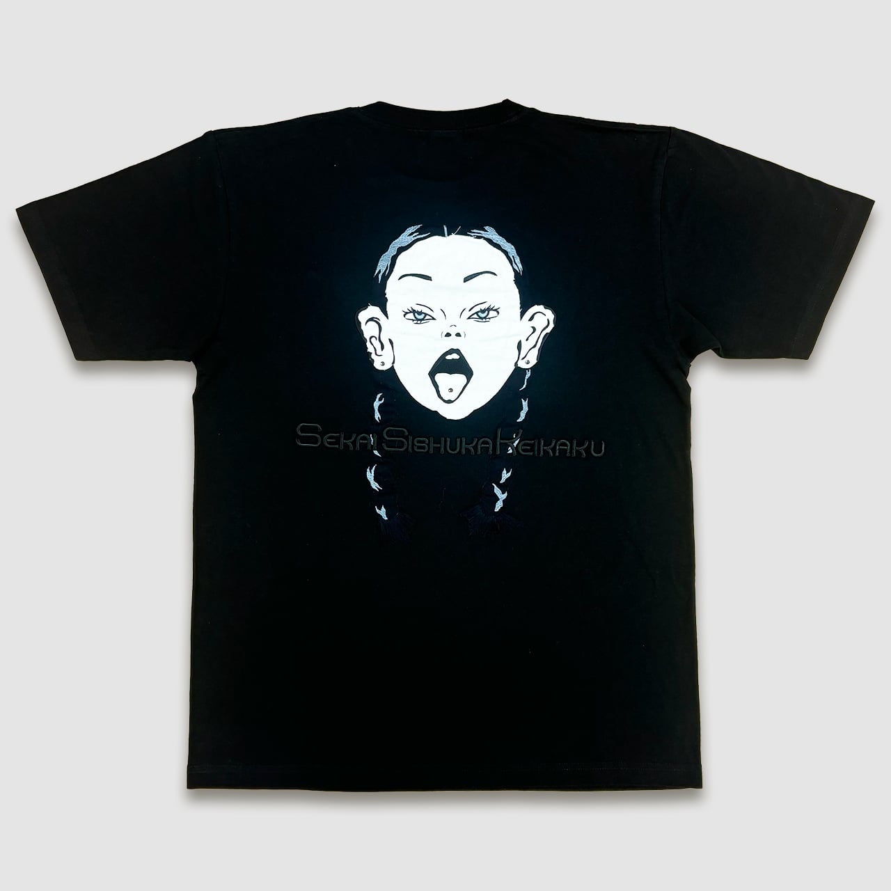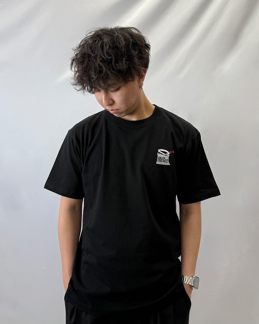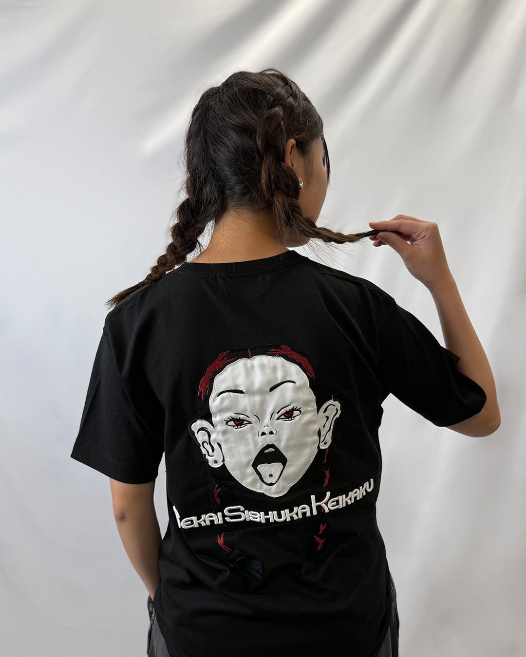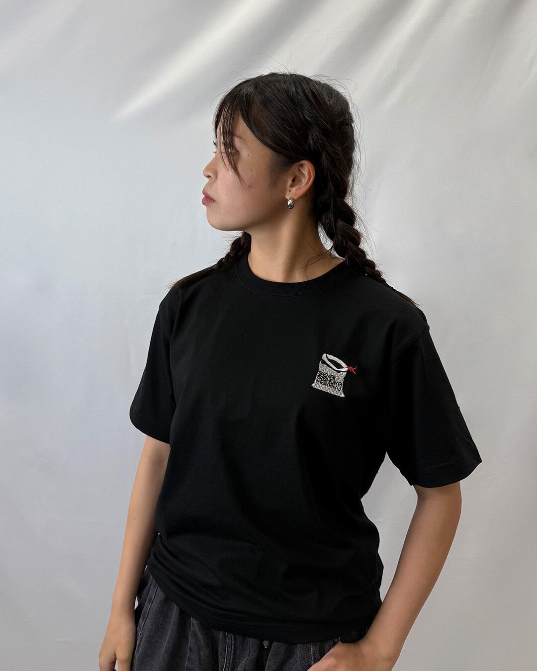 背中に大きく施した刺繍が目を惹く、ユニセックスタイプのTシャツ。